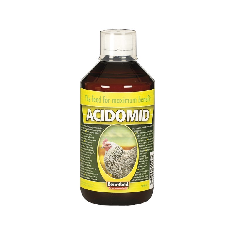 - jedná se o špičkový výrobek moderní koncepce působící nejen proti množení patogenních bakterií, ale velice dobře také tlumí rozvoj a množení nitrobuněčných parazitů jako např. kokcidií. ACIDOMID® však není léčivo, neobsahuje ani kokcidiostatika a nezanechává tak rezidua v organismu. Nemá také ochranné lhůty.