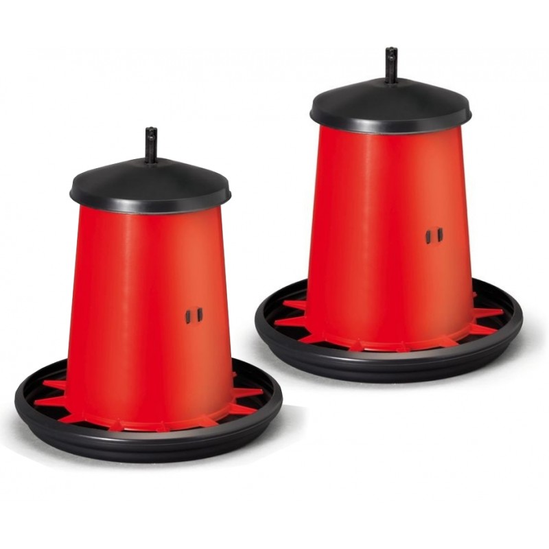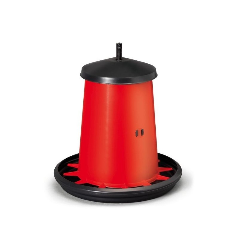 Závěsný krmný automat pro drůbež s plastovou středovou tyčí k regulaci krmné dávky. Zavěšením krmného automatu se snižuje riziko kontaminace krmení. Středová tyč má 3 otvory, které umožňují posun desky. Krmná dávka se nastaví pomocí zástrčky, která se zasune do otvoru a tím se válec upevní v požadované výšce.